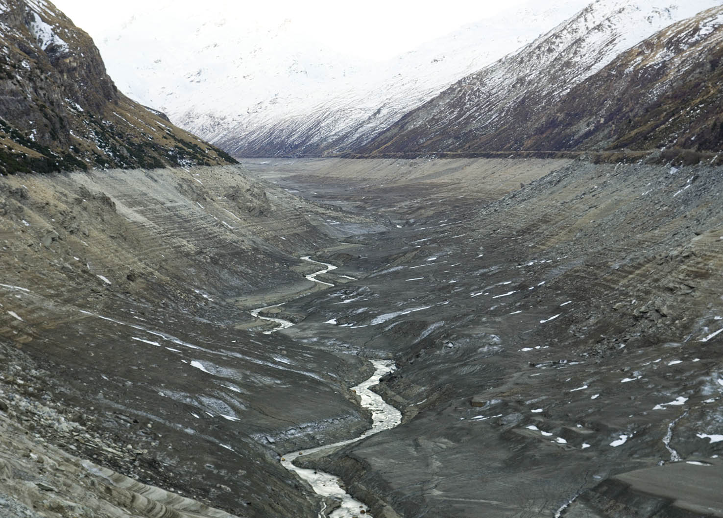 2011 und 2012 wird der Reno di Lei im Herbst unten auf dem Seegrund des Lago di Lei wieder sichtbar, ein mäandernder Fluss in der Wüste. Das Durcheinander von Wasserläufen und Rinnsalen, die dem Reno di Lei zustreben, ist faszinierend, so auch die Schneeresten vom Vortag und die grauen Sandbänke und Steinhalden. Im staunenden Sehen ahnt man zu hören, was war. Das Bild, das auch als Lautsprecher dient, erinnert an das was man nicht sehen kann: die Schafe, der Bach, der Bau der Staumauer…